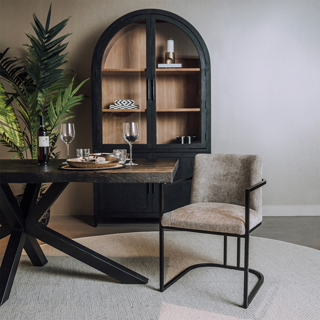 Een elegante stoel met een rustige, minimalistische uitstraling. De combinatie van een slank metalen frame en zachte stoffering zorgt voor een perfecte balans tussen comfort en design. Tijdloos en veelzijdig, passend in elk Japandi interieur.