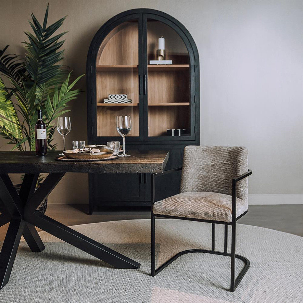Ontdek de Archi eetkamerstoel met armleuning van Tower Living: een perfecte mix van modern design, comfort en functionaliteit. Het zachte chenille in een warme beige tint nodigt uit om te gaan zitten, terwijl het zwarte buisframe een strak en stijlvol contrast creëert. Dankzij de ergonomisch gevormde rugleuning, de goed gevulde zitting en de comfortabele armleuningen geniet je van een luxueuze zitervaring – ideaal voor lange diners of gezellige bijeenkomsten aan tafel.