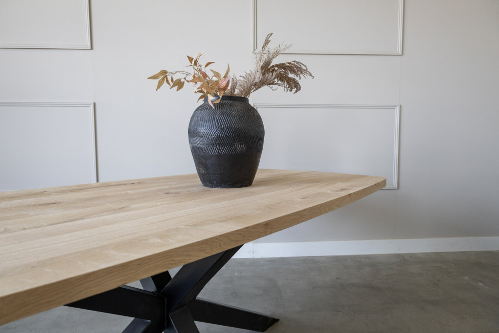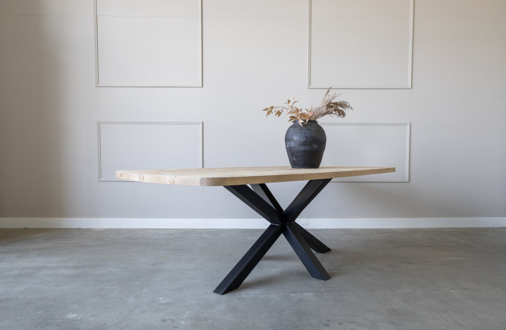 De tafel wordt gemaakt van Europees duurzaam eikenhout, dit wordt glad afgewerkt en geschuurd geleverd met behoud van de mooie tekening en uitstraling, aanwezige noesten worden gevuld in de gekozen afwerkingskleur.