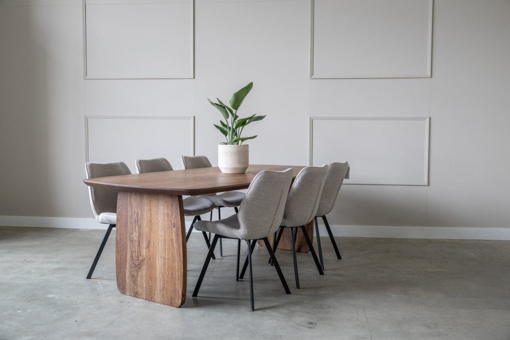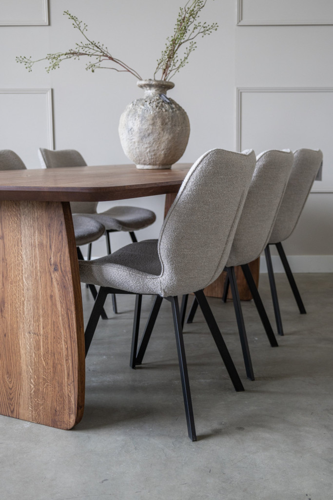 De ELLTON is de perfecte mix van klassieke charme en Scandinavisch design. Het ovale tafelblad van massief eiken heeft een subtiele, schuine rand die het geheel een licht en verfijnd profiel geeft. Het massief eiken onderstel heeft een speelse vorm en sluit naadloos aan bij het blad, een unieke combinatie van stijl en functionaliteit.