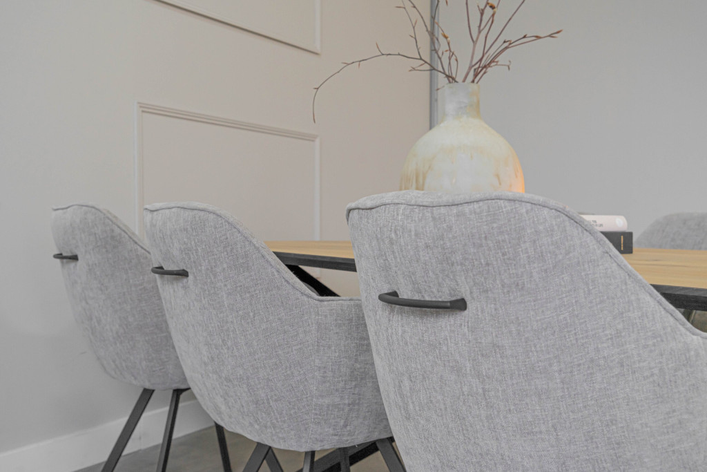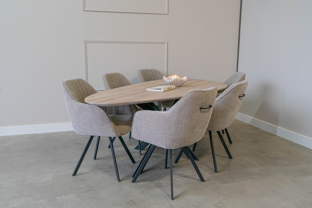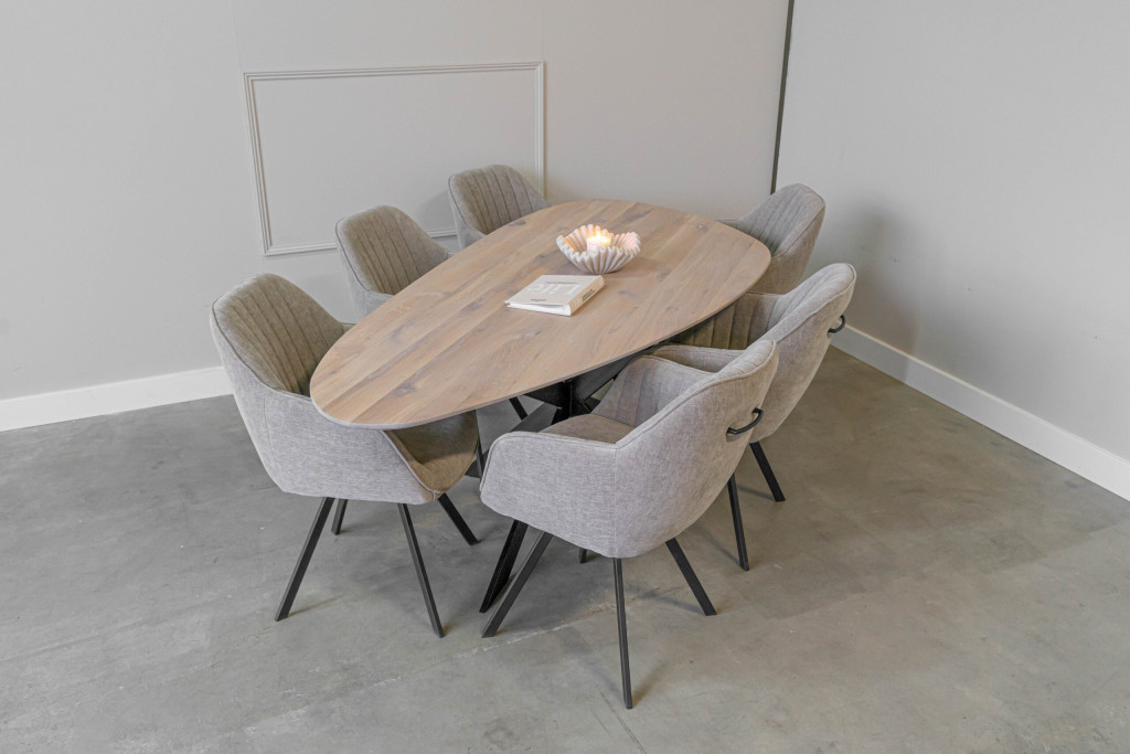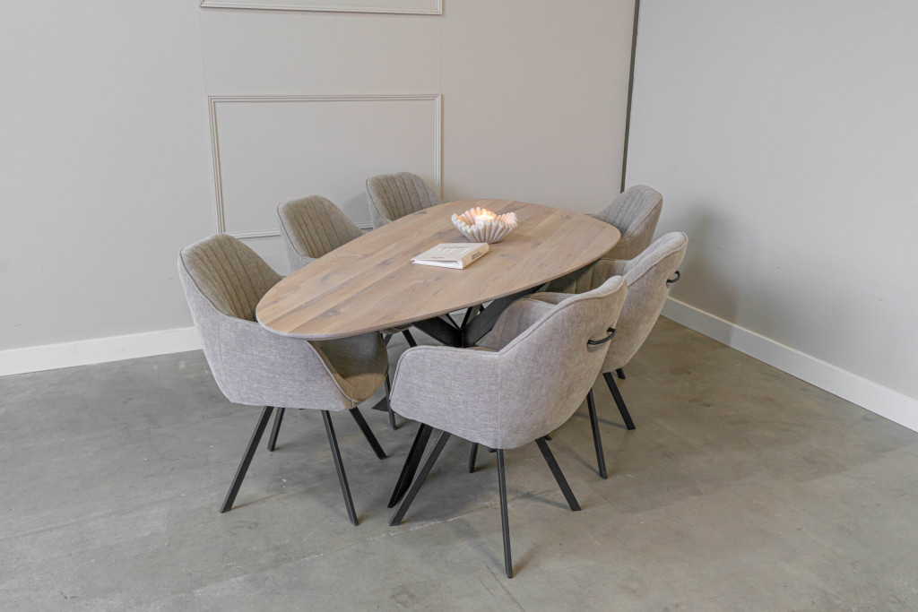 Of het nu in de eetkamer, woonkamer of als stijlvolle vergadertafel is – deze kiezelvormige eiken tafel is een echte eyecatcher die functionaliteit en design moeiteloos samenbrengt.