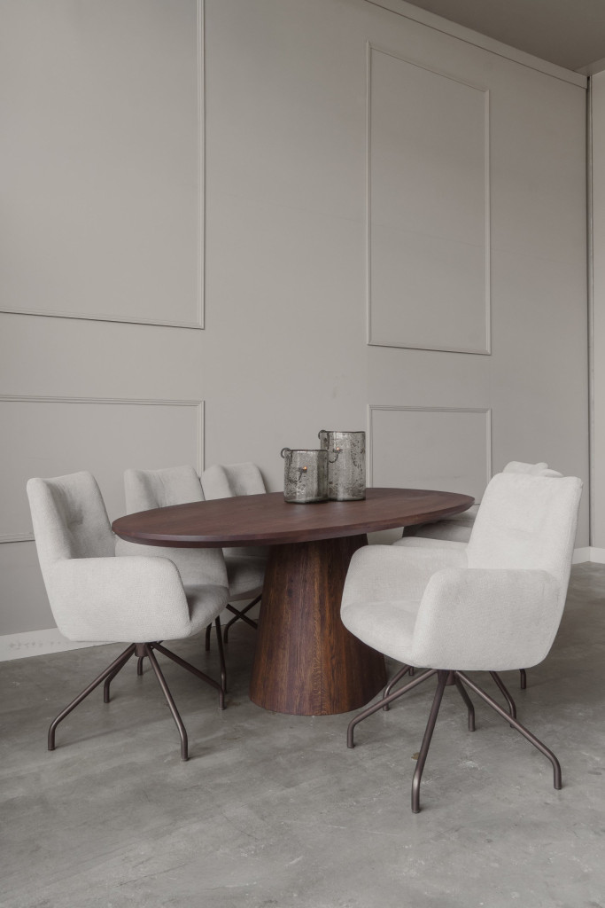 De zachte ronding van het blad en de subtiel verjongde rand geven de tafel een lichte, verfijnde uitstraling.