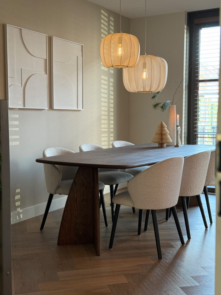 De combinatie van de elegante vorm en de natuurlijke houttekening geeft de tafel een warme, rustige uitstraling die perfect past in zowel moderne als Japandi interieurs.BLAD BEHANDELING VAN EIKEN EETTAFEL NOVA | MASSIVE WOOD