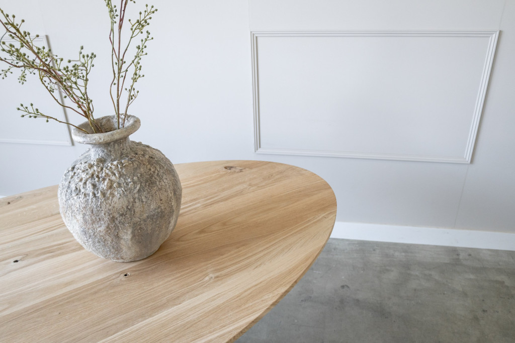 Op zoek naar een eiken tafel met een verfijnd ovaal 4 cm dik massief eiken tafelblad met een unieke poot? Ga dan voor de eiken eettafel ovaal verjongd STONE van Massive Wood. Het 4 cm dikke massief eiken blad is niet alleen ovaal van vorm, maar de rand is ook verjongd (afgeschuind), daardoor oogt de tafel luchtig, subtiel en verfijnd.