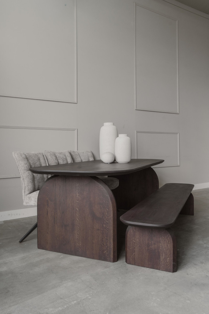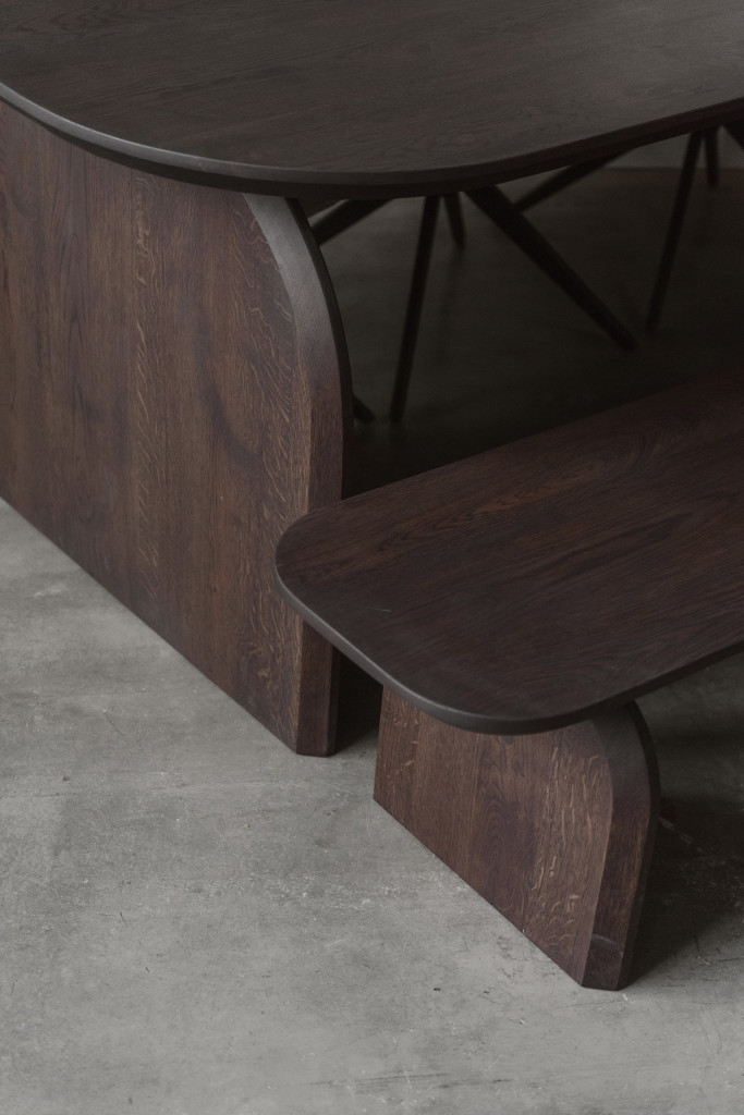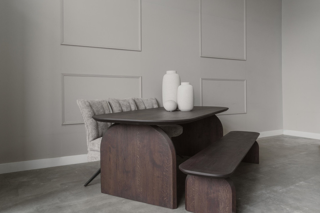 De tafel wordt gemaakt van Europees duurzaam eikenhout, dit wordt glad afgewerkt en geschuurd geleverd met behoud van de mooie tekening en uitstraling, aanwezige noesten worden gevuld in de gekozen afwerkingskleur.