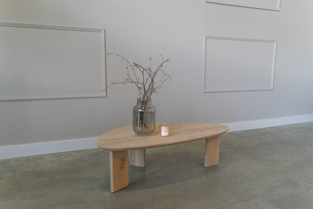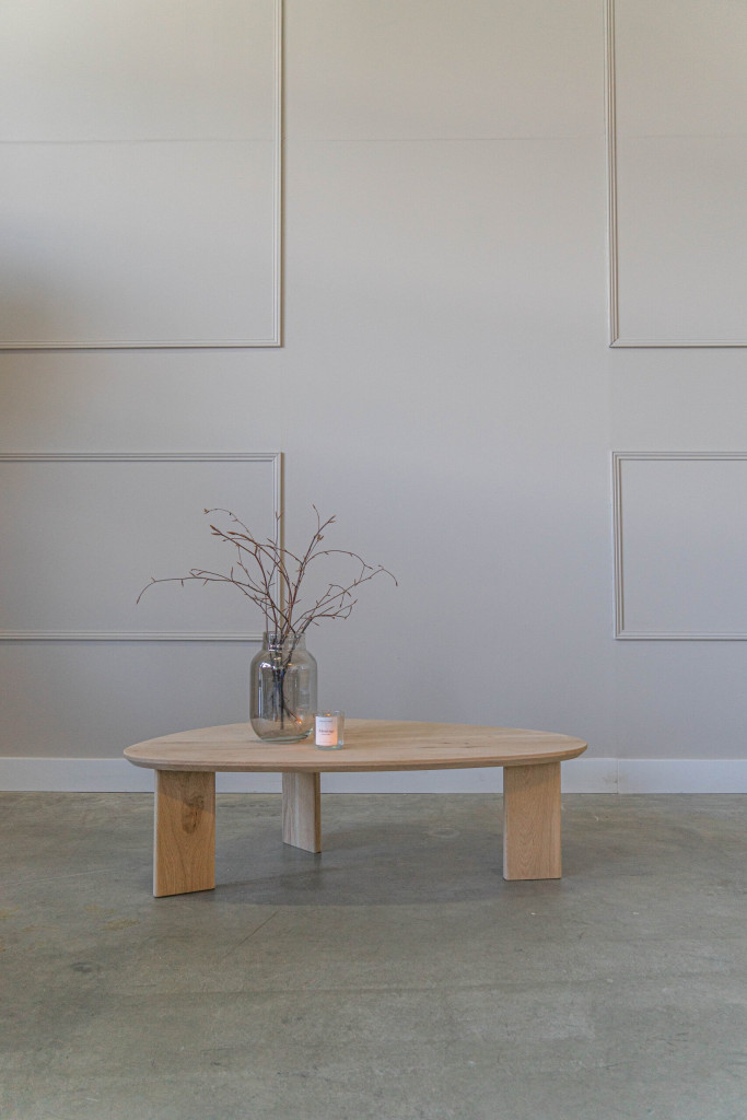 Ontdek de LUTON een speelse salontafel van massief eikenhout die direct warmte en sfeer in je woonkamer brengt. Het organische blad geeft de tafel een luchtige en natuurlijke uitstraling, terwijl de drie stevige poten zorgen voor stabiliteit en een elegante touch.