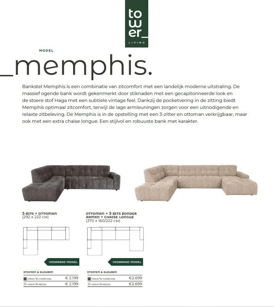Onze bank Memphis is een stijlvolle blikvanger die comfort en design perfect combineert. Met zijn zachte, royale vormen en subtiele vlakverdeling heeft de bank een rustige en warme uitstraling die moeiteloos past in een trendy interieur. De rijke bekleding en diepe zitting zorgen voor een heerlijk comfortabel zitgevoel, terwijl het ontwerp een luxe en uitnodigende sfeer creëert in de woonkamer.