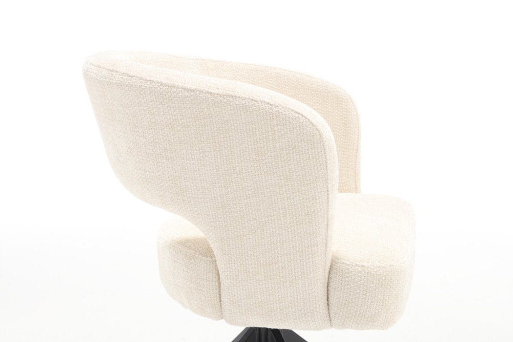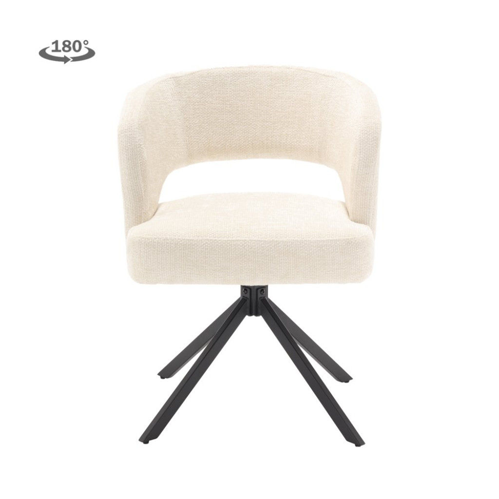 Comfort en design komen samen in deze moderne draaistoel met zachte beige bekleding. Perfect voor lange diners of een stijlvolle werkplek.